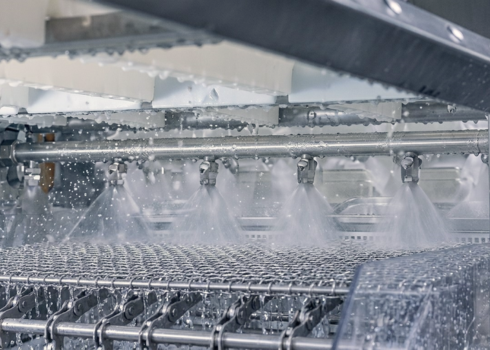 El producto pasa por una zona de enjuague para eliminar los restos de detergente. La estructura abierta de la banda facilita que el agua de aclarado drene con rapidez.